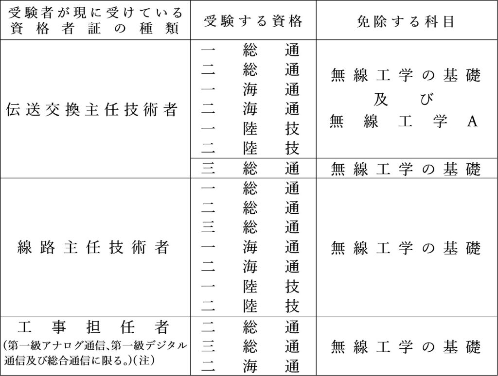 これらの資格者証を持っている人が、無線従事者国家試験を受ける場合は、一部の科目の試験が免除されます。その免除の区分は下記の表のとおりです。(無線従事者規則第8条第3項)